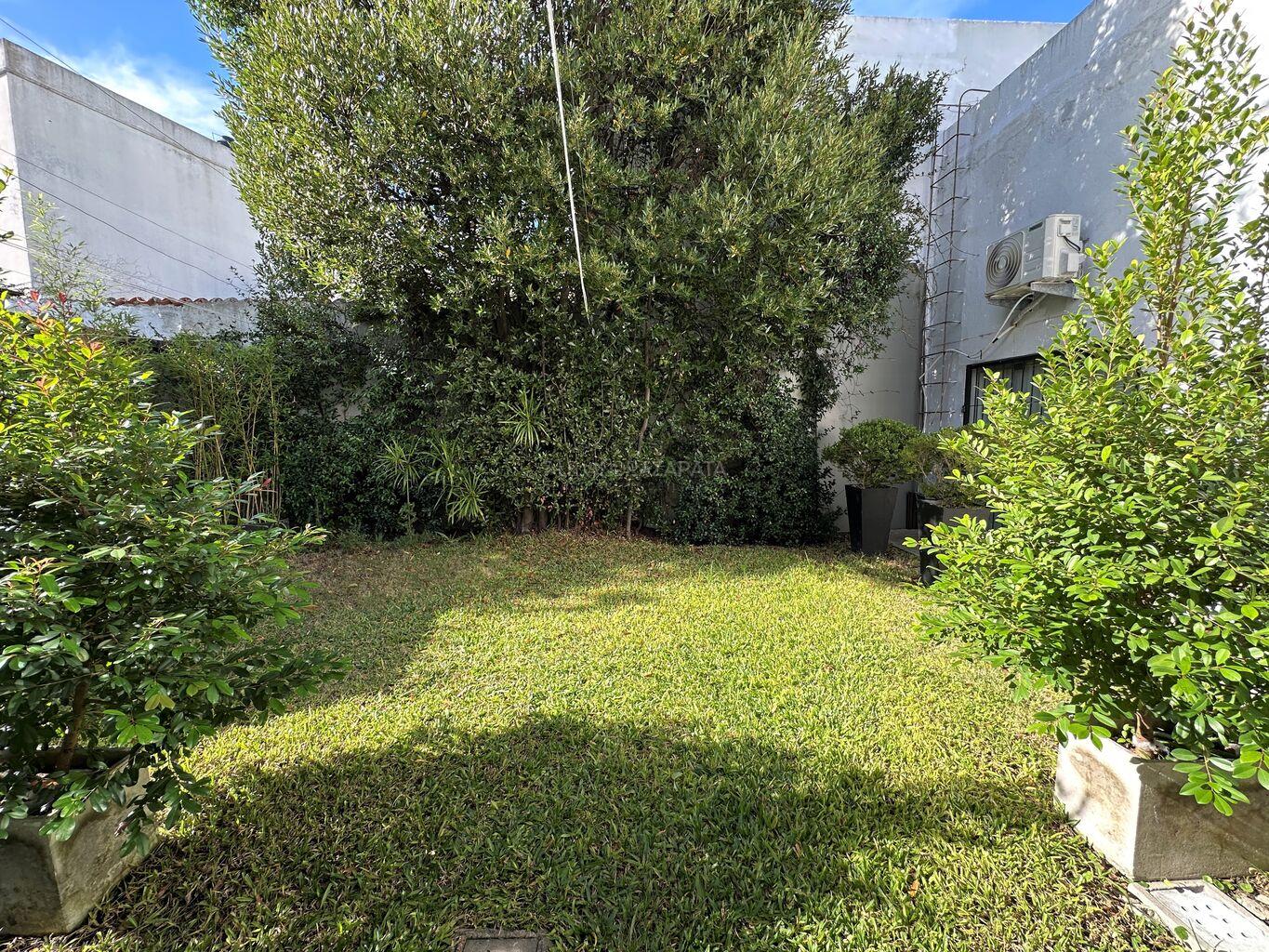 Precioso jardín verde que ilumina la casa con parrillero y un depósito.