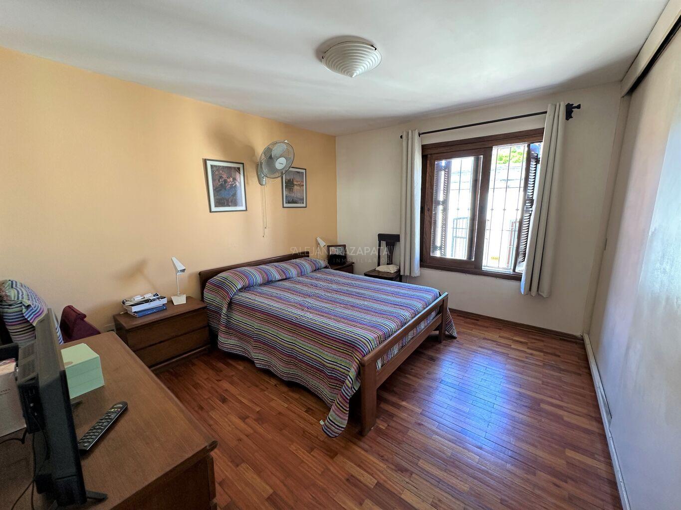 En planta alta, un hall de distribución luminoso conecta los tres dormitorios, todos con placares, ventanales de madera, postigones y rejas. Aquí también se encuentra el segundo baño completo, recientemente reciclado, con ventilación y luz natural.