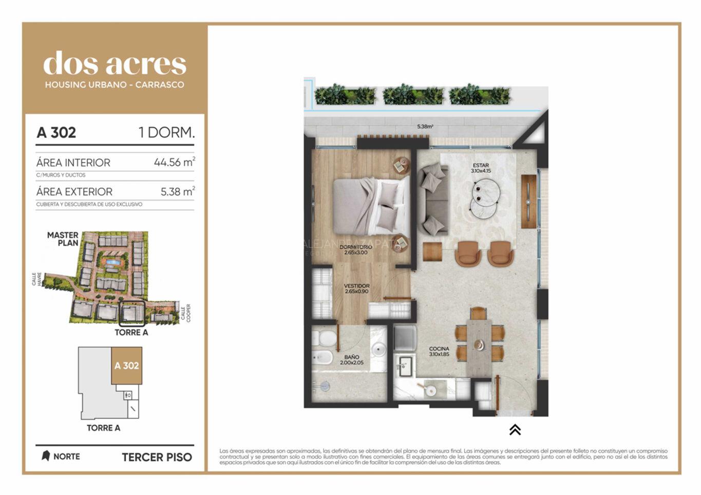 Precioso apartamento A ESTRENAR en el Housing Dos Acres. Un proyecto ubicado en Carrasco Norte, en Cooper y Máximo Tajes. En un terreno de 9.000m2 se desarrolla este hermoso housing de casas y apartamentos, con increíbles aménities, un lugar precioso para vivir, en un entorno seguro y de mucho crecimiento.