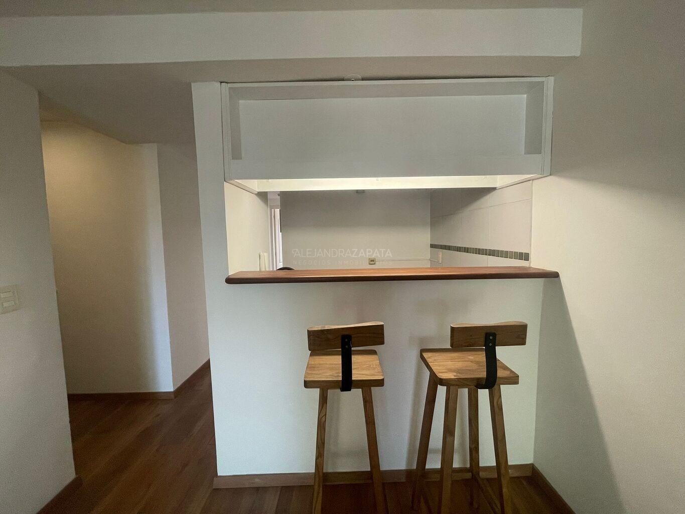Cocina integrada con barra desayunadora. Buena capacidad de placares sobre y bajo mesada.